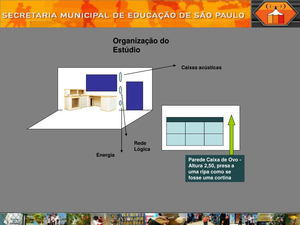 Características do estúdio • Espaço com dimensões ideais de 4 metros quadrados • Isolação acústica com espuma acústica ou de forma alternativa usando caixas de ovos • Instalação elétrica com 4 tomadas e ponto de rede lógica • Instalação do estúdio preferencialmente no pátio escolar,próximo ao palco • Janela de vidro para comunicação visual do estúdio com pátio • Janela para entrada de ar • Mobiliário para estúdio