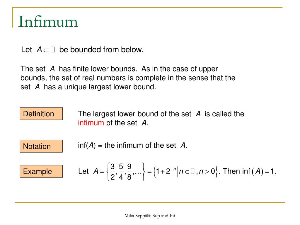 Infimum The set A has finite lower bounds. As in the case of upper bounds, the set of real numbers is complete in the sense that the set A has a unique largest lower bound. Definition The largest lower bound of the set A is called the infimum of the set A. inf(A) = the infimum of the set A. Notation Example Mika Seppälä: Sup and Inf