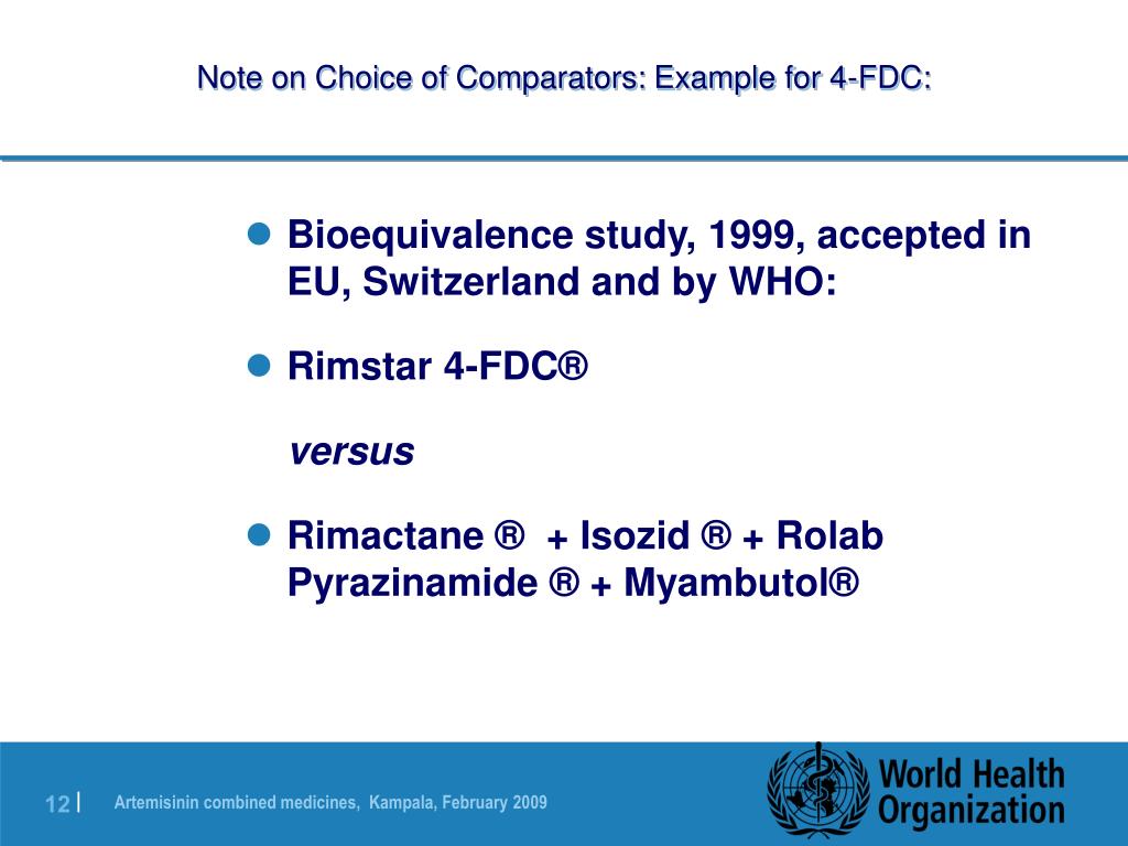 Note on Choice of Comparators: Example for 4-FDC: • Bioequivalence study, 1999, accepted in EU, Switzerland and by WHO: • Rimstar 4-FDC® versus • Rimactane ® + Isozid ® + Rolab Pyrazinamide ® + Myambutol®