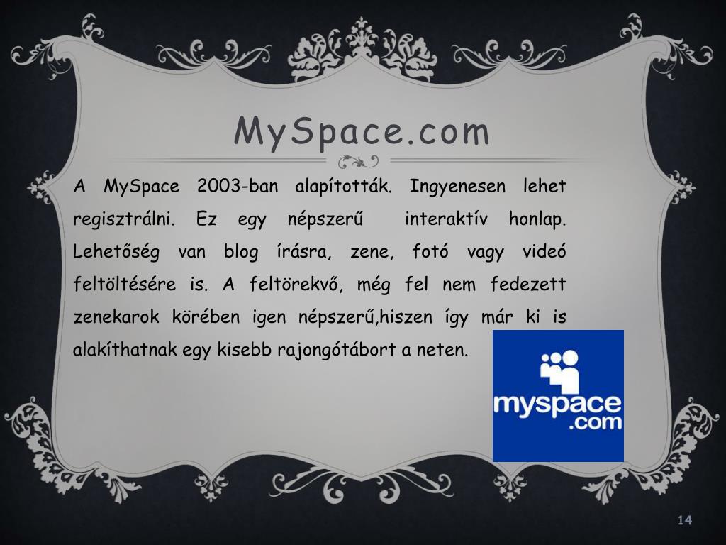 MySpace.com A MySpace 2003-ban alapították. Ingyenesen lehet regisztrálni. Ez egy népszerű interaktív honlap. Lehetőség van blog írásra, zene, fotó vagy videó feltöltésére is. A feltörekvő, még fel nem fedezett zenekarok körében igen népszerű,hiszen így már ki is alakíthatnak egy kisebb rajongótábort a neten.