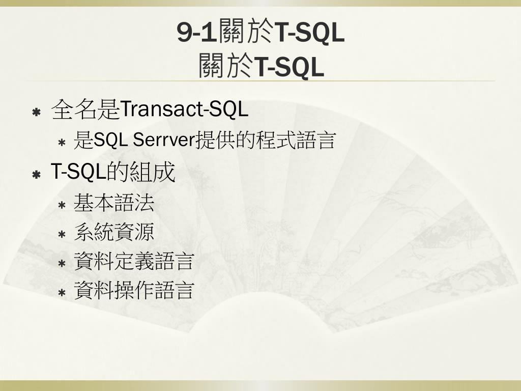 9-1關於T-SQL關於T-SQL • 全名是Transact-SQL • 是SQL Serrver提供的程式語言 • T-SQL的組成 • 基本語法 • 系統資源 • 資料定義語言 • 資料操作語言