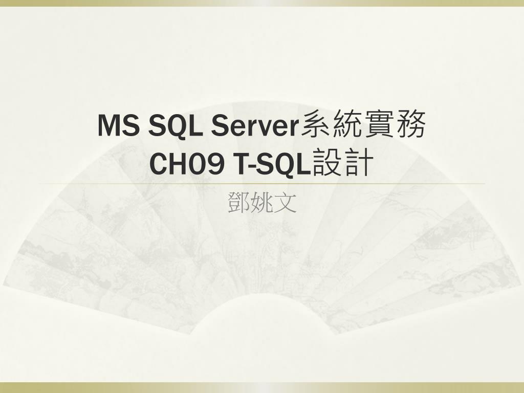 課程參與度之評估方式. 上課時必須專心聽講,跟上進度,參與討論 扣 分項目 玩線上遊戲一次扣 1 分 玩手機一次扣 1 分 睡覺一次扣 1 分 聊天一次扣 1 分 無法回答老師提出的問題一次扣 1 分 加分項目 主動回答老師的問題一次加 2 分 找出老師程式中的錯誤一次加 1 分 修正老師程式中的錯誤一次加 4 分. MS SQL Server 系統實務 CH09 T-SQL 設計. 鄧姚文. 大綱. 關於 T-SQL 基本語法說明 實務說明. 9-1 關於 T-SQL 關於 T-SQL. 全名是 Transact-SQL