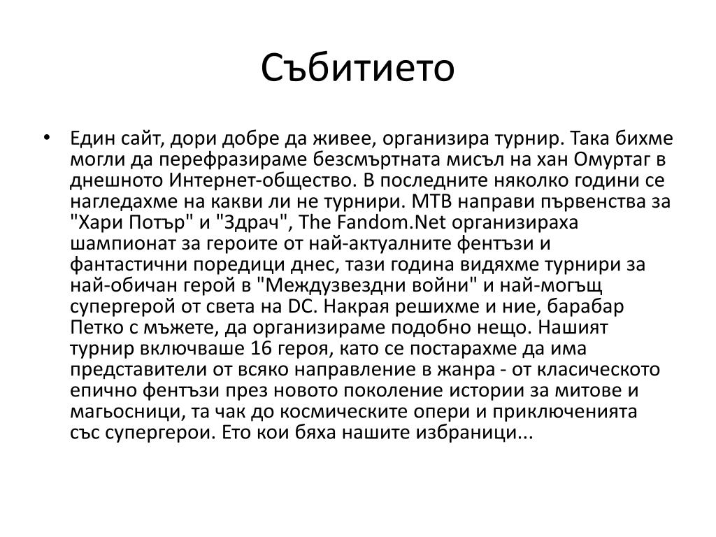 Събитието • Един сайт, дори добре да живее, организира турнир. Така бихме могли да перефразираме безсмъртната мисъл на хан Омуртаг в днешното Интернет-общество. В последните няколко години се нагледахме на какви ли не турнири. МТВ направи първенства за "Хари Потър" и "Здрач", The Fandom.Net организираха шампионат за героите от най-актуалните фентъзи и фантастични поредици днес, тази година видяхме турнири за най-обичан герой в "Междузвездни войни" и най-могъщ супергерой от света на DC. Накрая решихме и ние, барабар Петко с мъжете, да организираме подобно нещо. Нашият турнир включваше 16 героя, като се постарахме да има представители от всяко направление в жанра - от класическото епично фентъзи през новото поколение истории за митове и магьосници, та чак до космическите опери и приключенията със супергерои. Ето кои бяха нашите избраници...