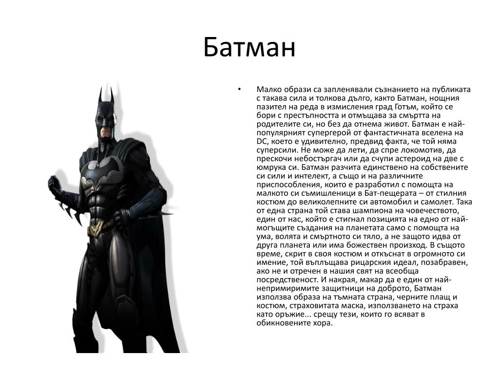 Батман • Малко образи са запленявали съзнанието на публиката с такава сила и толкова дълго, както Батман, нощния пазител на реда в измисления град Готъм, който се бори с престъпността и отмъщава за смъртта на родителите си, но без да отнема живот. Батман е най-популярният супергерой от фантастичната вселена на DC, което е удивително, предвид факта, че той няма суперсили. Не може да лети, да спре локомотив, да прескочи небостъргач или да счупи астероид на две с юмрука си. Батман разчита единствено на собствените си сили и интелект, а също и на различните приспособления, които е разработил с помощта на малкото си съмишленици в Бат-пещерата – от стилния костюм до великолепните си автомобил и самолет. Така от една страна той става шампиона на човечеството, един от нас, който е стигнал позицията на едно от най-могъщите създания на планетата само с помощта на ума, волята и смъртното си тяло, а не защото идва от друга планета или има божествен произход. В същото време, скрит в своя костюм и откъснат в огромното си имение, той въплъщава рицарския идеал, позабравен, ако не и отречен в нашия свят на всеобща посредственост. И накрая, макар да е един от най-непримиримите защитници на доброто, Батман използва образа на тъмната страна, черните плащ и костюм, страховитата маска, използването на страха като оръжие... срещу тези, които го всяват в обикновените хора.