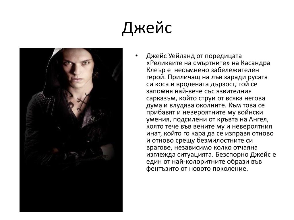 Джейс • Джейс Уейланд от поредицата «Реликвите на смъртните» на Касандра Клеър е несъмнено забележителен герой. Приличащ на лъв заради русата си коса и вродената дързост, той се запомня най-вече със язвителния сарказъм, който струи от всяка негова дума и влудява околните. Към това се прибавят и невероятните му войнски умения, подсилени от кръвта на Ангел, която тече във вените му и невероятния инат, който го кара да се изправя отново и отново срещу безмилостните си врагове, независимо колко отчаяна изглежда ситуацията. Безспорно Джейс е един от най-колоритните образи във фентъзито от новото поколение.