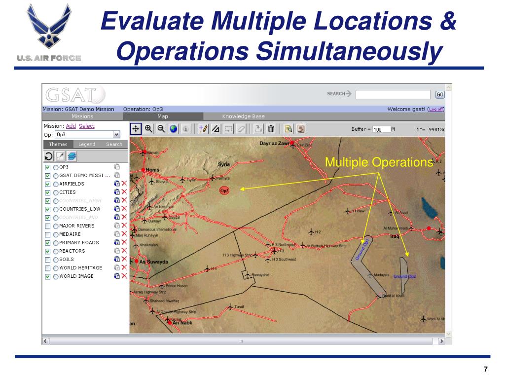 GSAT ConOps GSAT Concept of Operations • Site surveys conducted via netcentric tool • Retrieve data from multiple, continuously updated databases • Rapidly evaluates risk(s) of multiple forward sites • Provides Mitigating COA’s to Reduce ESOH, Operational risks • Deliberate and tactical planning
