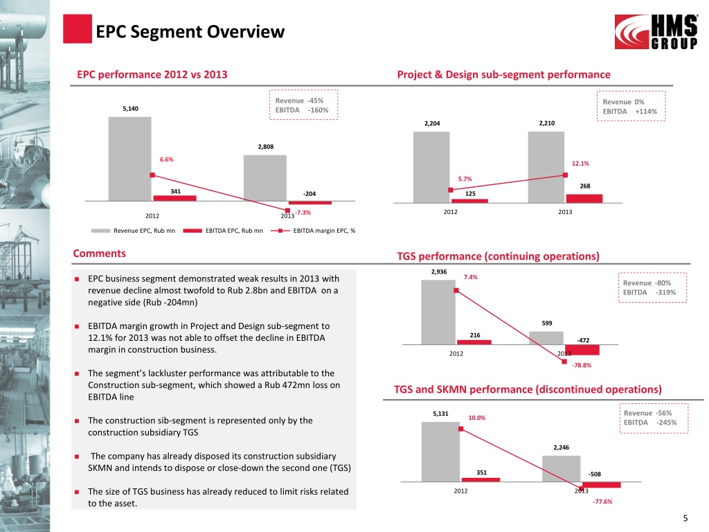 EPC Segment Overview EPC performance 2012 vs 2013 Project & Design sub-segment performance Revenue -45% EBITDA -160% Revenue 0% EBITDA +114% Comments TGS performance (continuing operations) • EPC business segment demonstrated weak results in 2013 with revenue decline almost twofold to Rub 2.8bn and EBITDA on a negative side (Rub -204mn) • EBITDA margin growth in Project and Design sub-segment to 12.1% for 2013 was not able to offset the decline in EBITDA margin in construction business. • The segment’s lackluster performance was attributable to the Construction sub-segment, which showed a Rub 472mn loss on EBITDA line • The construction sib-segment is represented only by the construction subsidiary TGS • The company has already disposed its construction subsidiary SKMN and intends to dispose or close-down the second one (TGS) • The size of TGS business has already reduced to limit risks related to the asset. • . Revenue -80% EBITDA -319% TGS and SKMN performance (discontinued operations) Revenue -56% EBITDA -245%
