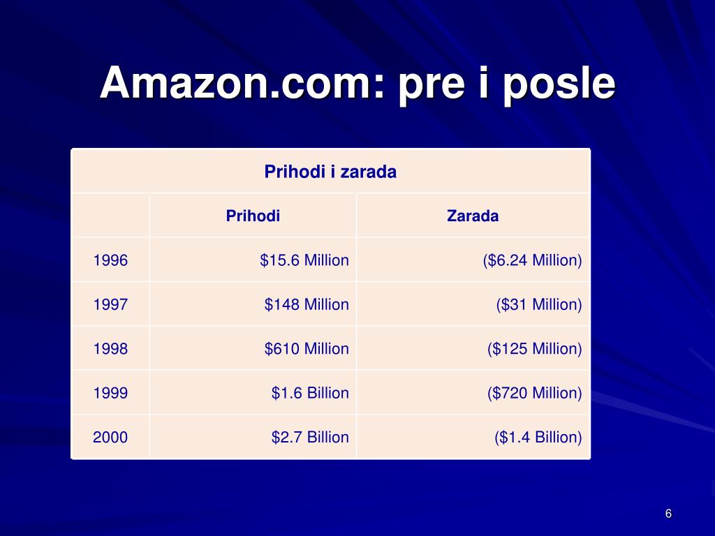 Prihodi i zarada Prihodi Zarada 1996 $15.6 Million ($6.24 Million) 1997 $148 Million ($31 Million) 1998 $610 Million ($125 Million) 1999 $1.6 Billion ($720 Million) 2000 $2.7 Billion ($1.4 Billion) Amazon.com: pre i posle