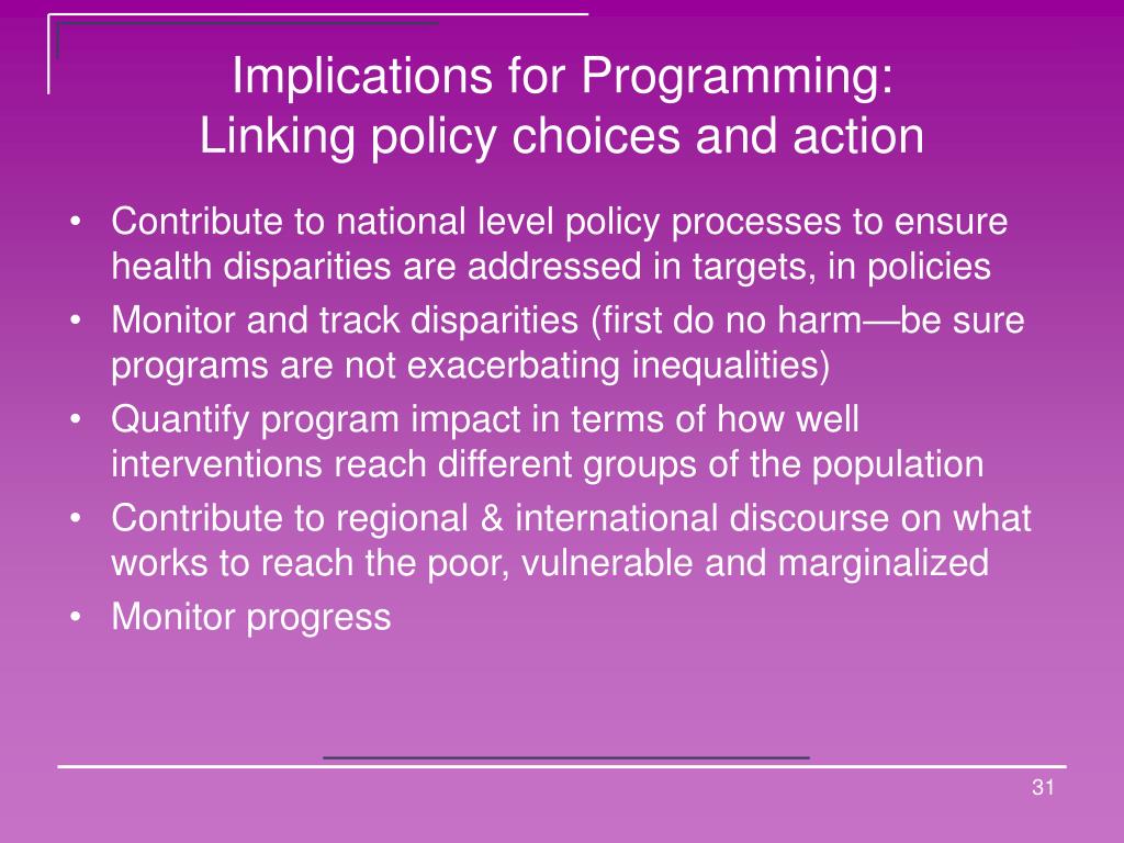 Implications for Programming: Linking policy choices and action • Contribute to national level policy processes to ensure health disparities are addressed in targets, in policies • Monitor and track disparities (first do no harm—be sure programs are not exacerbating inequalities) • Quantify program impact in terms of how well interventions reach different groups of the population • Contribute to regional & international discourse on what works to reach the poor, vulnerable and marginalized • Monitor progress