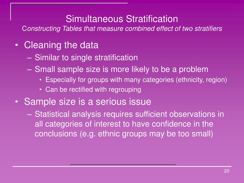 Simultaneous StratificationConstructing Tables that measure combined effect of two stratifiers • Cleaning the data • Similar to single stratification • Small sample size is more likely to be a problem • Especially for groups with many categories (ethnicity, region) • Can be rectified with regrouping • Sample size is a serious issue • Statistical analysis requires sufficient observations in all categories of interest to have confidence in the conclusions (e.g. ethnic groups may be too small)