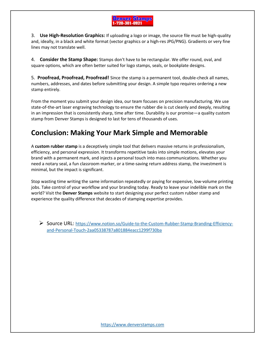3. Use High-Resolution Graphics:If uploading a logo or image, the source file must be high-quality and, ideally, in a black and white format (vector graphics or a high-res JPG/PNG). Gradients or very fine lines may not translate well. 4. Consider the Stamp Shape:Stamps don't have to be rectangular. We offer round, oval, and square options, which are often better suited for logo stamps, seals, or bookplate designs. 5. Proofread, Proofread, Proofread!Since the stamp is a permanent tool, double-check all names, numbers, addresses, and dates before submitting your design. A simple typo requires ordering a new stamp entirely. From the moment you submit your design idea, our team focuses on precision manufacturing. We use state-of-the-art laser engraving technology to ensure the rubber die is cut cleanly and deeply, resulting in an impression that is consistently sharp, time after time. Durability is our promise—a quality custom stamp from Denver Stamps is designed to last for tens of thousands of uses. Conclusion: Making Your Mark Simple and Memorable A custom rubber stamp is a deceptively simple tool that delivers massive returns in professionalism, efficiency, and personal expression. It transforms repetitive tasks into simple motions, elevates your brand with a permanent mark, and injects a personal touch into mass communications. Whether you need a notary seal, a fun classroom marker, or a time-saving return address stamp, the investment is minimal, but the impact is significant. Stop wasting time writing the same information repeatedly or paying for expensive, low-volume printing jobs. Take control of your workflow and your branding today. Ready to leave your indelible mark on the world? Visit the Denver Stamps website to start designing your perfect custom rubber stamp and experience the quality difference that decades of stamping expertise provides. Source URL:https://www.notion.so/Guide-to-the-Custom-Rubber-Stamp-Branding-Efficiency- and-Personal-Touch-2aa05338787a801884eacc1299f730ba https://www.denverstamps.com
