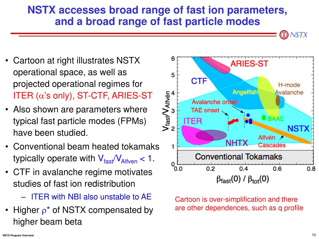 NSTX accesses broad range of fast ion parameters, and a broad range of fast particle modes • Cartoon at right illustrates NSTX operational space, as well as projected operational regimes for ITER (a’s only), ST-CTF, ARIES-ST • Also shown are parameters where typical fast particle modes (FPMs) have been studied. • Conventional beam heated tokamaks typically operate with Vfast/VAlfven < 1. • CTF in avalanche regime motivates studies of fast ion redistribution • ITER with NBI also unstable to AE • Higher* of NSTX compensated by higher beam beta Cartoon is over-simplification and there are other dependences, such as q profile