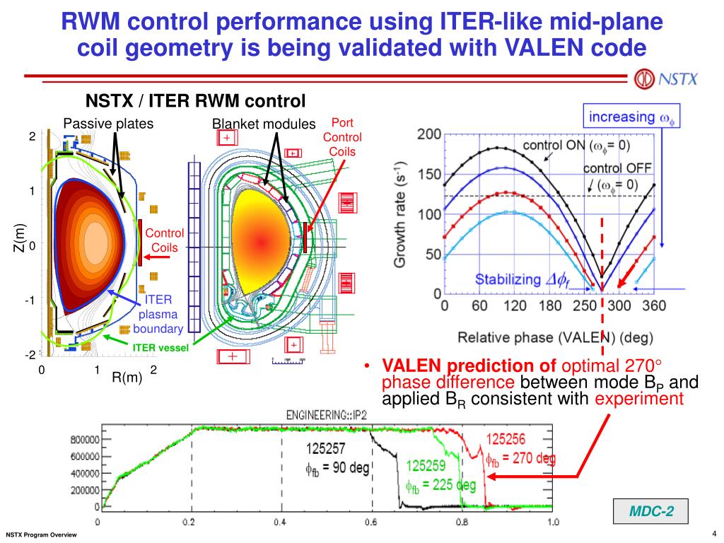 2 Passive plates Blanket modules Port Control Coils 1 Control Coils Z(m) 0 ITER plasma boundary -1 ITER vessel 0 1 2 -2 R(m) RWM control performance using ITER-like mid-plane coil geometry is being validated with VALEN code NSTX / ITER RWM control • VALEN prediction of optimal 270 phase difference between mode BP and applied BR consistent with experiment MDC-2