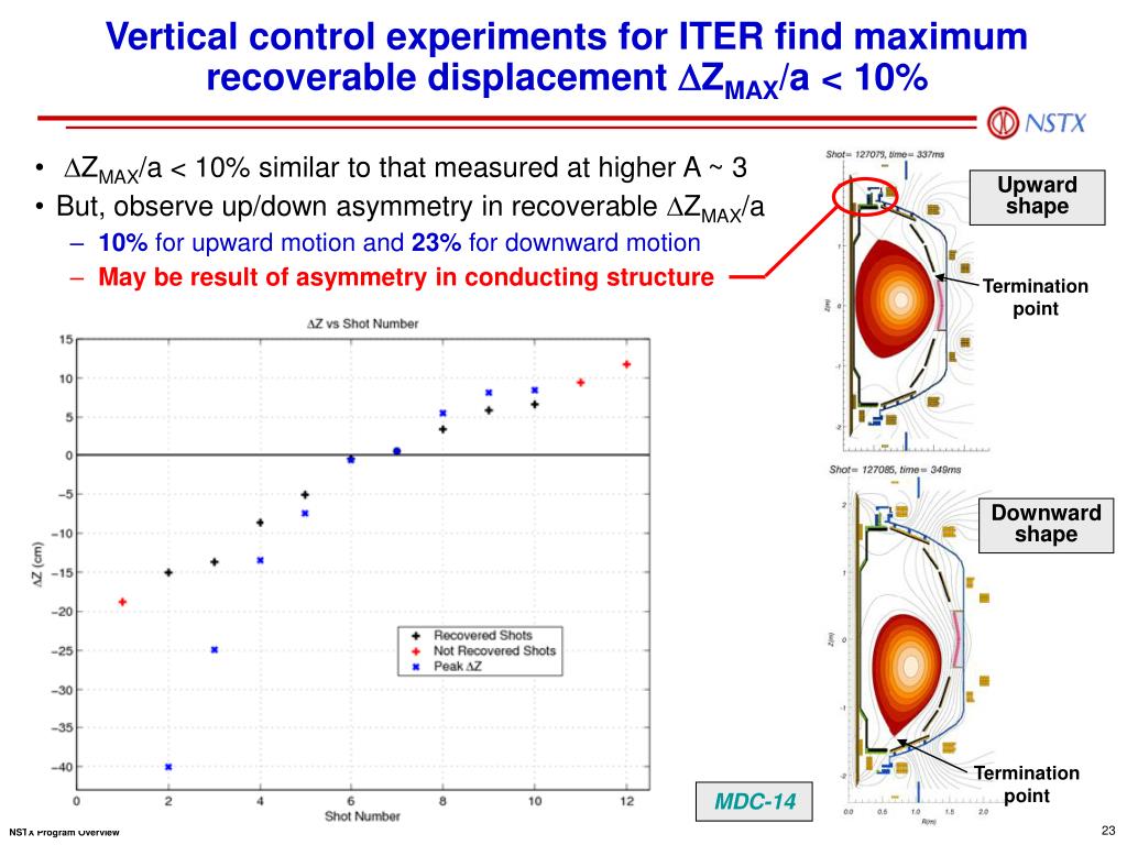 Vertical control experiments for ITER find maximum recoverable displacement DZMAX/a < 10% Upward shape • DZMAX/a < 10% similar to that measured at higher A ~ 3 • But, observe up/down asymmetry in recoverable DZMAX/a • 10% for upward motion and 23% for downward motion • May be result of asymmetry in conducting structure Termination point Downward shape Termination point MDC-14
