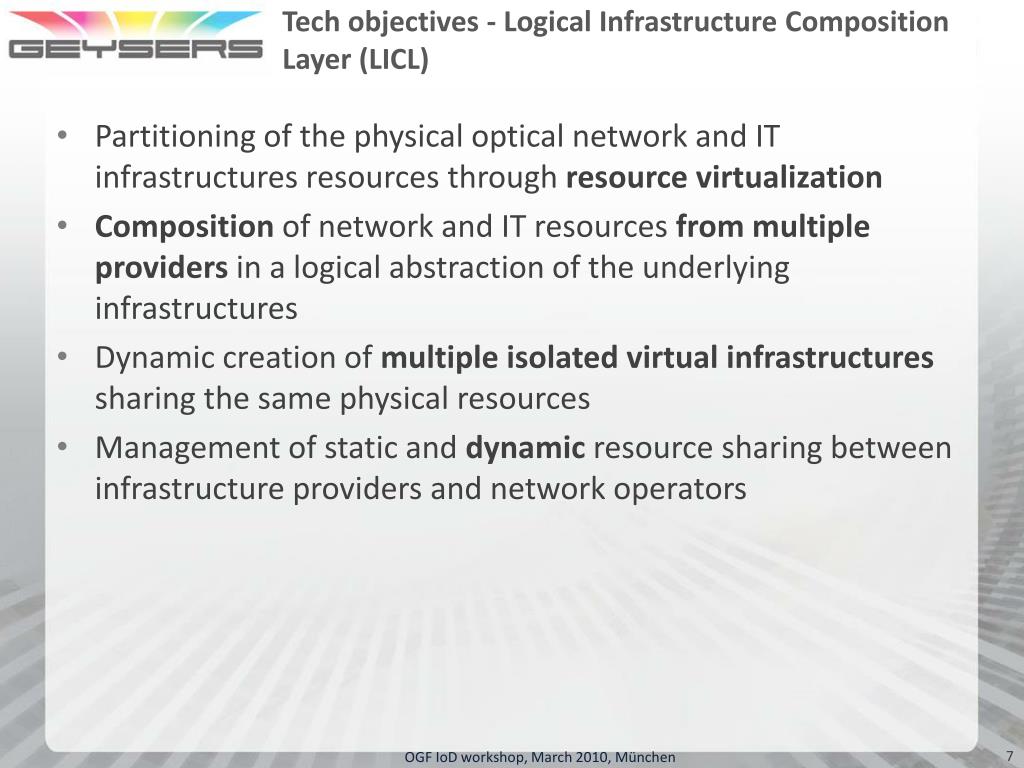 Main innovation tracks & research challenges [1] AAA for infrastructure virtualization services More dynamic and flexible infrastructure segmentation mechanisms GEYSERS LICL Multiple Network Operators each one with its own logical infrastructure Logical Infrastructure replanning Support for Network Control Plane able to think of and trigger infrastructure replanning Multiple switching technologies under the same Network Control Plane Market place for exchange of logical infrastructure resources Uniform description languages for both network and IT resources