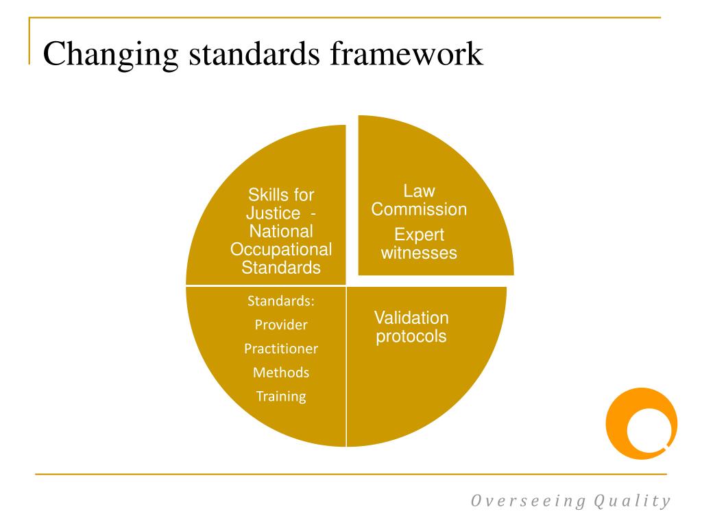 Principles Overriding obligation to the Criminal Justice System Providers should be accredited by a recognised independent body to accepted standards; Practitioners should be able to demonstrate, through an independent process, their on-going competence and development; Each method should be based on sound science supported by sufficient data to justify its use within the CJS and a robust interpretation model, and, where possible, validated according to accepted scientific procedures; Accountability for standards rests with senior managers; and Records of accreditation, competence and validation must be accurate, retained and available for disclosure through the court process. O v e r s e e i n g Q u a l i t y