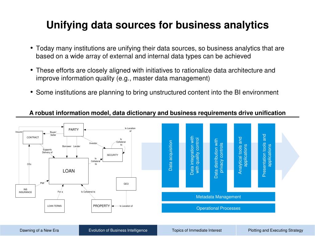 Data acquisition Data integration withwith quality control Analytical tools and applications Presentation tools andapplications Data distribution with privacy controls Metadata Management Operational Processes Unifying data sources for business analytics • Today many institutions are unifying their data sources, so business analytics that are based on a wide array of external and internal data types can be achieved • These efforts are closely aligned with initiatives to rationalize data architecture and improve information quality (e.g., master data management) • Some institutions are planning to bring unstructured content into the BI environment A robust information model, data dictionary and business requirements drive unification Evolution of Business Intelligence Topics of Immediate Interest Plotting and Executing Strategy Dawning of a New Era