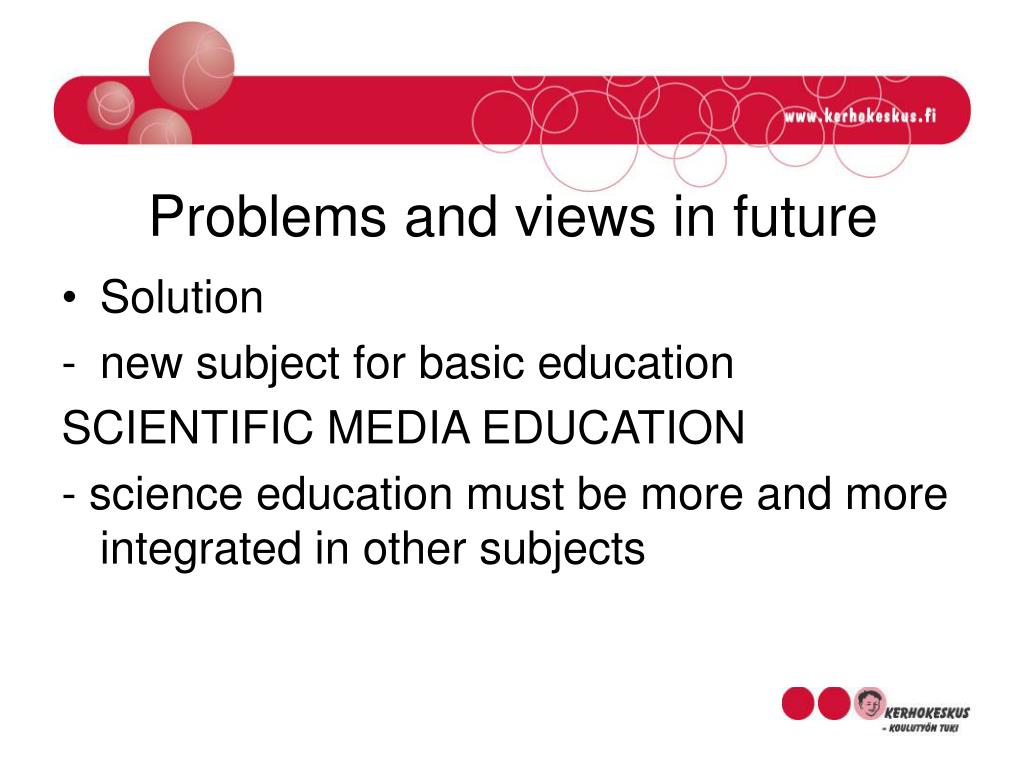 Problems and views in future • Solution • new subject for basic education SCIENTIFIC MEDIA EDUCATION - science education must be more and more integrated in other subjects