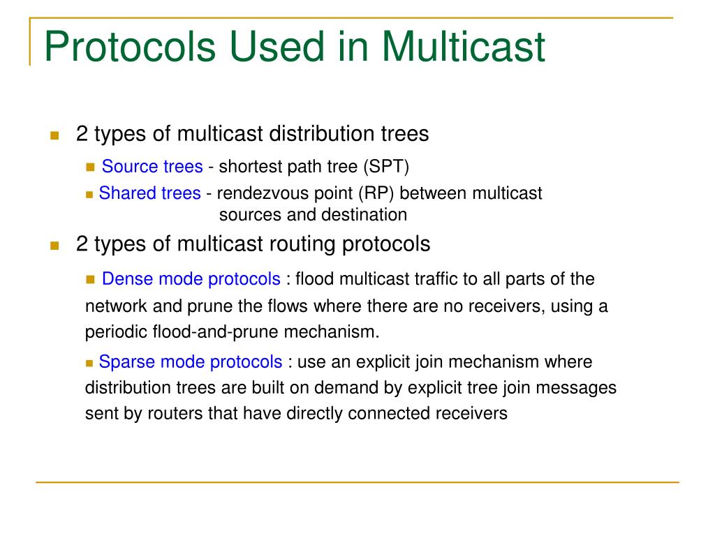 Protocols Used in Multicast • 2 types of multicast distribution trees • Source trees - shortest path tree (SPT) • Shared trees - rendezvous point (RP) between multicast sources and destination • 2 types of multicast routing protocols • Dense mode protocols : flood multicast traffic to all parts of the network and prune the flows where there are no receivers, using a periodic flood-and-prune mechanism. • Sparse mode protocols : use an explicit join mechanism where distribution trees are built on demand by explicit tree join messages sent by routers that have directly connected receivers