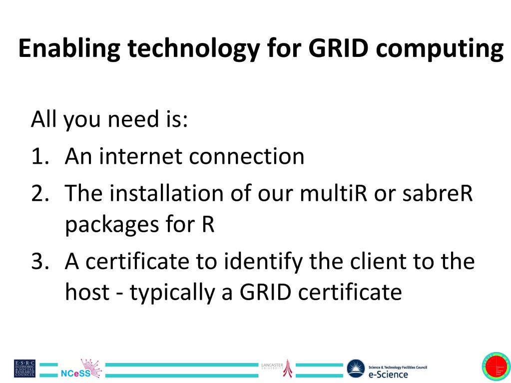 Enabling technology for GRID computing All you need is: • An internet connection • The installation of our multiR or sabreR packages for R • A certificate to identify the client to the host - typically a GRID certificate