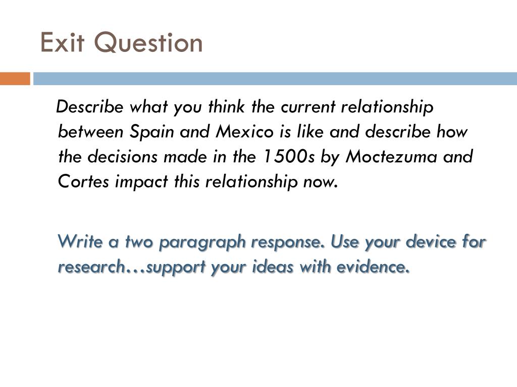 Exit Question Describe what you think the current relationship between Spain and Mexico is like and describe how the decisions made in the 1500s by Moctezuma and Cortes impact this relationship now. Write a two paragraph response. Use your device for research…support your ideas with evidence.