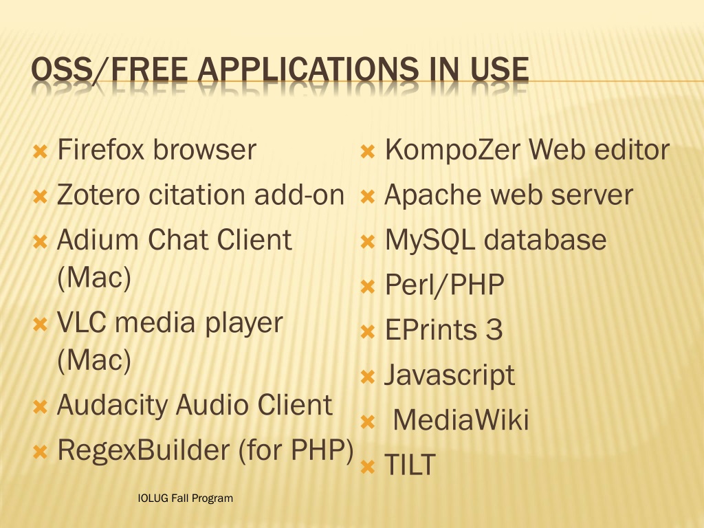 OSS/FREE APPLICATIONS IN uSE IOLUG Fall Program Firefox browser Zotero citation add-on Adium Chat Client (Mac) VLC media player (Mac) Audacity Audio Client RegexBuilder (for PHP) KompoZer Web editor Apache web server MySQL database Perl/PHP EPrints 3 Javascript MediaWiki TILT