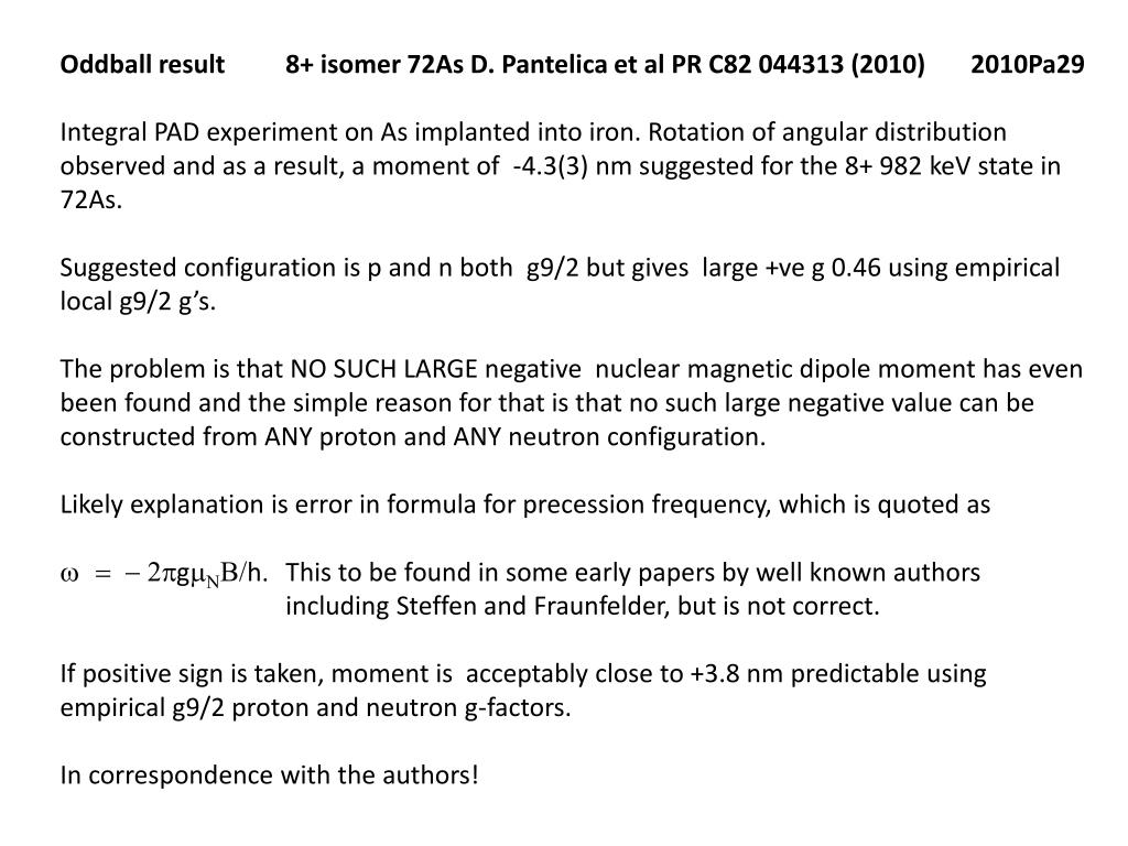 Oddball result 8+ isomer 72As D. Pantelica et al PR C82 044313 (2010) 2010Pa29 • Integral PAD experiment on As implanted into iron. Rotation of angular distribution observed and as a result, a moment of -4.3(3) nm suggested for the 8+ 982 keV state in 72As. • Suggested configuration is p and n both g9/2 but gives large +ve g 0.46 using empirical local g9/2 g’s. • The problem is that NO SUCH LARGE negative nuclear magnetic dipole moment has even been found and the simple reason for that is that no such large negative value can be constructed from ANY proton and ANY neutron configuration. • Likely explanation is error in formula for precession frequency, which is quoted as • = - 2pgmNB/h. This to be found in some early papers by well known authors including Steffen and Fraunfelder, but is not correct. • If positive sign is taken, moment is acceptably close to +3.8 nm predictable using empirical g9/2 proton and neutron g-factors. • In correspondence with the authors!