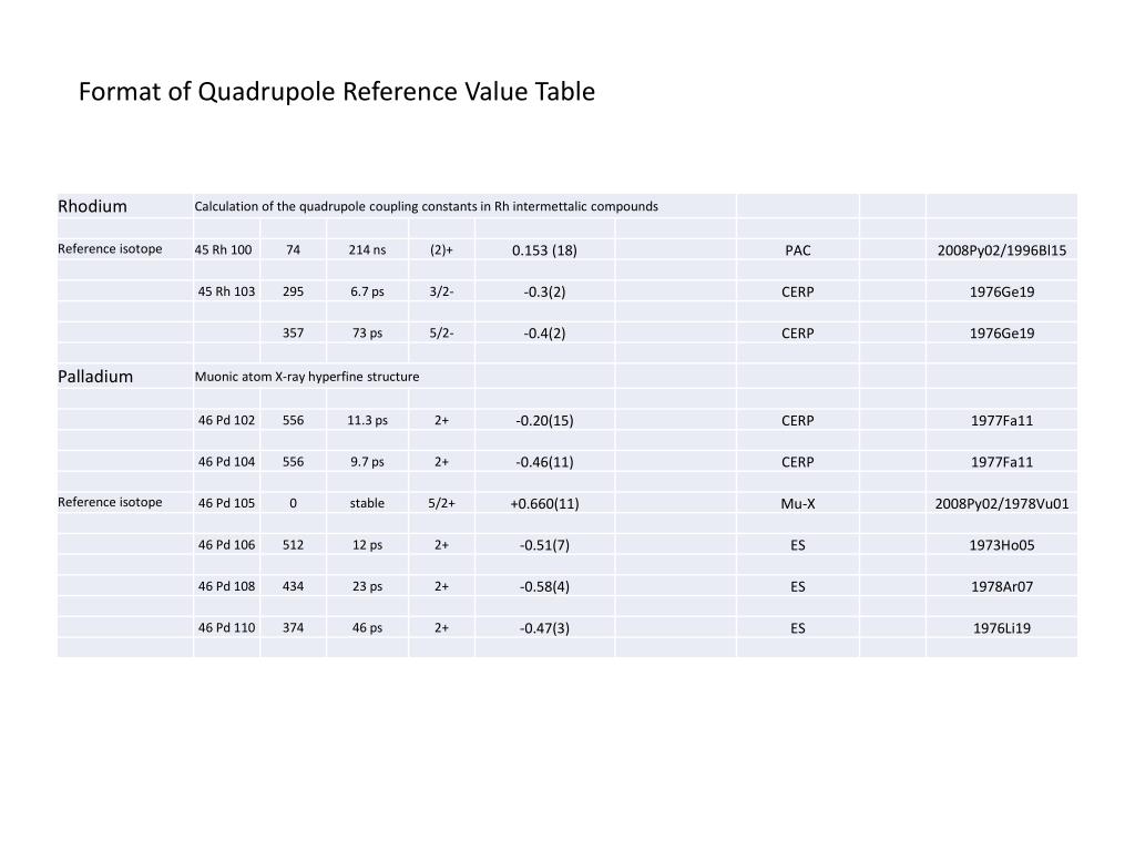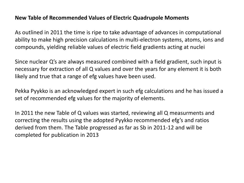 New Table of Recommended Values of Electric Quadrupole Moments As outlined in 2011 the time is ripe to take advantage of advances in computational ability to make high precision calculations in multi-electron systems, atoms, ions and compounds, yielding reliable values of electric field gradients acting at nuclei Since nuclear Q’s are always measured combined with a field gradient, such input is necessary for extraction of all Q values and over the years for any element it is both likely and true that a range of efg values have been used. Pekka Pyykko is an acknowledged expert in such efg calculations and he has issued a set of recommended efg values for the majority of elements. In 2011 the new Table of Q values was started, reviewing all Q measurments and correcting the results using the adopted Pyykko recommended efg’s and ratios derived from them. The Table progressed as far as Sb in 2011-12 and will be completed for publication in 2013