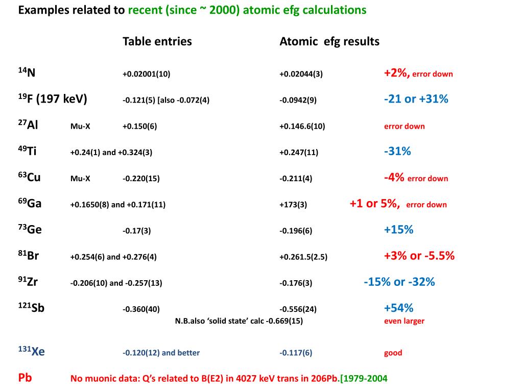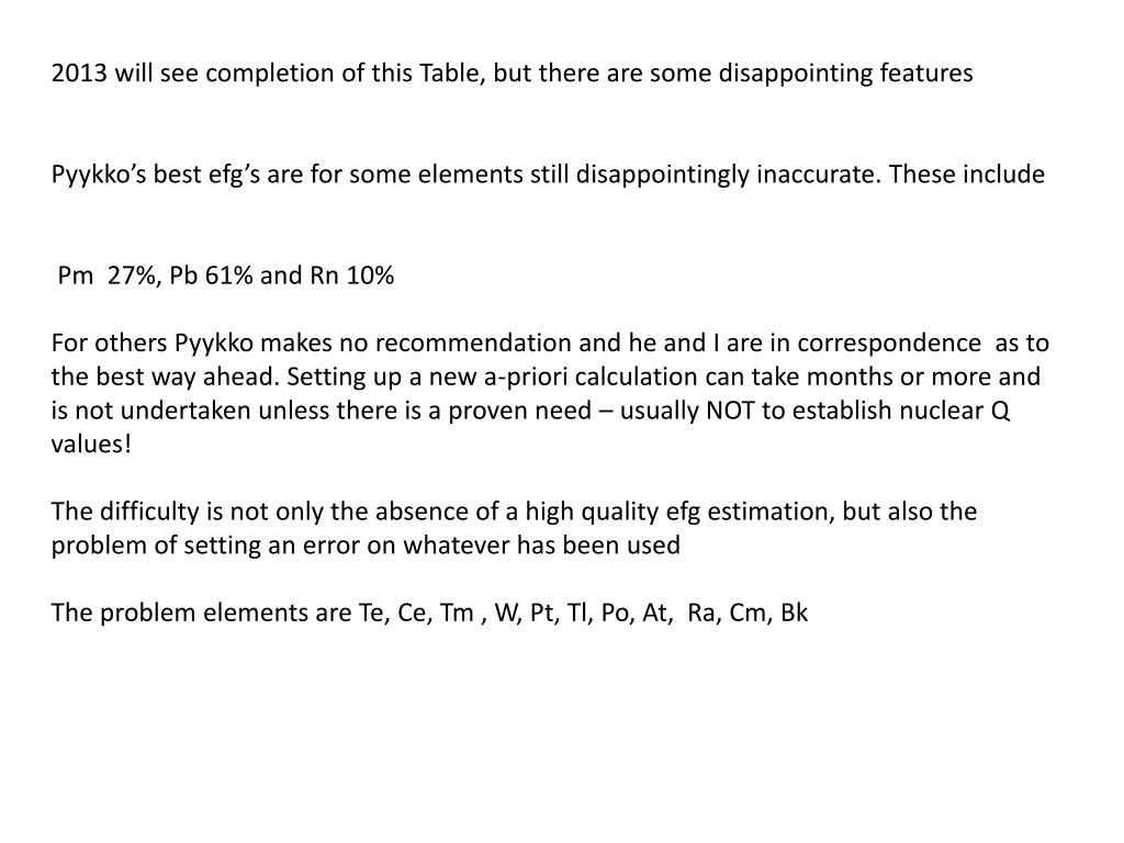 2013 will see completion of this Table, but there are some disappointing features Pyykko’s best efg’s are for some elements still disappointingly inaccurate. These include Pm 27%, Pb 61% and Rn 10% For others Pyykko makes no recommendation and he and I are in correspondence as to the best way ahead. Setting up a new a-priori calculation can take months or more and is not undertaken unless there is a proven need – usually NOT to establish nuclear Q values! The difficulty is not only the absence of a high quality efg estimation, but also the problem of setting an error on whatever has been used The problem elements are Te, Ce, Tm , W, Pt, Tl, Po, At, Ra, Cm, Bk