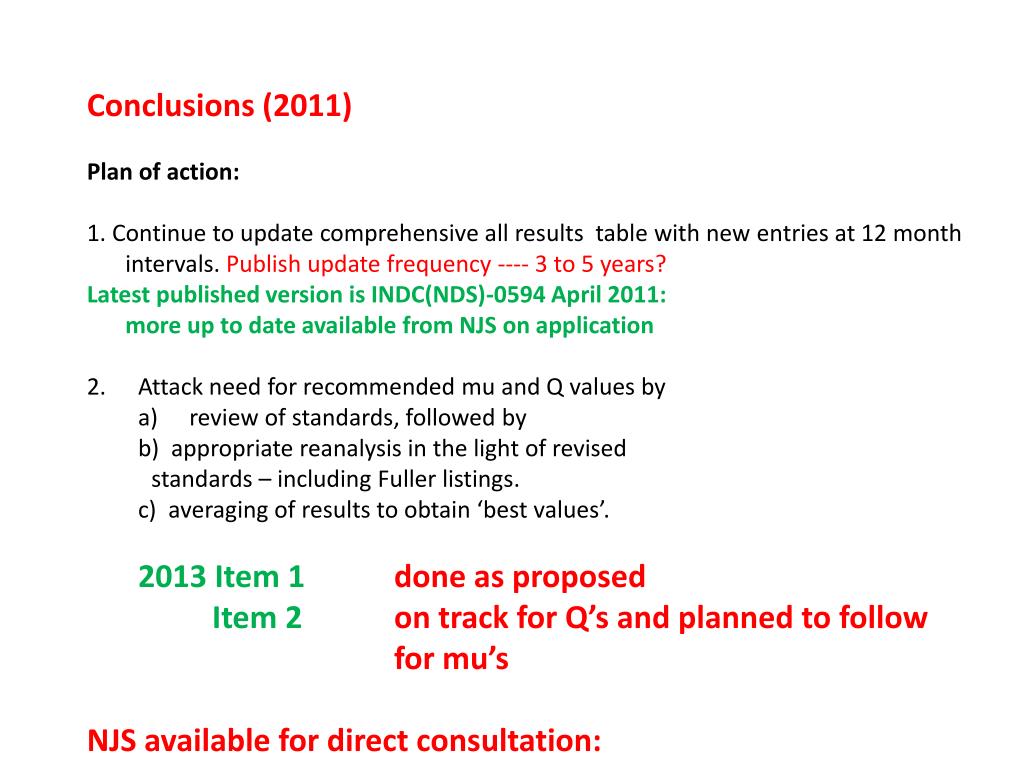 Conclusions (2011) • Plan of action: • 1. Continue to update comprehensive all results table with new entries at 12 month • intervals. Publish update frequency ---- 3 to 5 years? • Latest published version is INDC(NDS)-0594 April 2011: • more up to date available from NJS on application • Attack need for recommended mu and Q values by • a) review of standards, followed by • b) appropriate reanalysis in the light of revised • standards – including Fuller listings. • c) averaging of results to obtain ‘best values’. • 2013 Item 1 done as proposed • Item 2 on track for Q’s and planned to follow for mu’s • NJS available for direct consultation: n.stone@physics.ox.ac.uk
