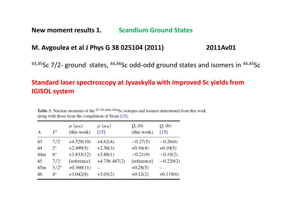 New moment results 1. Scandium Ground States M. Avgoulea et al J Phys G 38 025104 (2011) 2011Av01 43,45Sc 7/2- ground states, 44,46Sc odd-odd ground states and isomers in 44,45Sc Standard laser spectroscopy at Jyvaskylla with improved Sc yields from IGISOL system