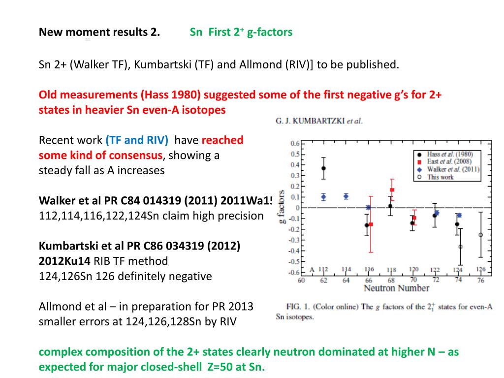 New moment results 2. Sn First 2+ g-factors Sn 2+ (Walker TF), Kumbartski(TF) and Allmond (RIV)] to be published. Old measurements (Hass 1980) suggested some of the first negative g’s for 2+ states in heavier Sn even-A isotopes Recent work (TF and RIV) have reached some kind of consensus, showing a steady fall as A increases Walker et al PR C84 014319 (2011) 2011Wa15 112,114,116,122,124Sn claim high precision Kumbartskiet al PR C86 034319 (2012) 2012Ku14 RIB TF method 124,126Sn 126 definitely negative Allmond et al – in preparation for PR 2013 smaller errors at 124,126,128Sn by RIV complex composition of the 2+ states clearly neutron dominated at higher N – as expected for major closed-shell Z=50 at Sn.