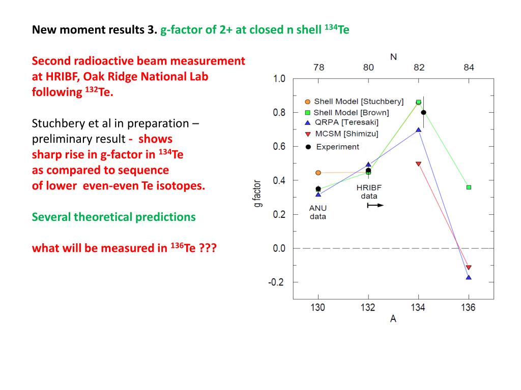 New moment results 3. g-factor of 2+ at closed n shell 134Te Second radioactive beam measurement at HRIBF, Oak Ridge National Lab following 132Te. Stuchbery et al in preparation – preliminary result - shows sharp rise in g-factor in 134Te as compared to sequence of lower even-even Te isotopes. Several theoretical predictions what will be measured in 136Te ???