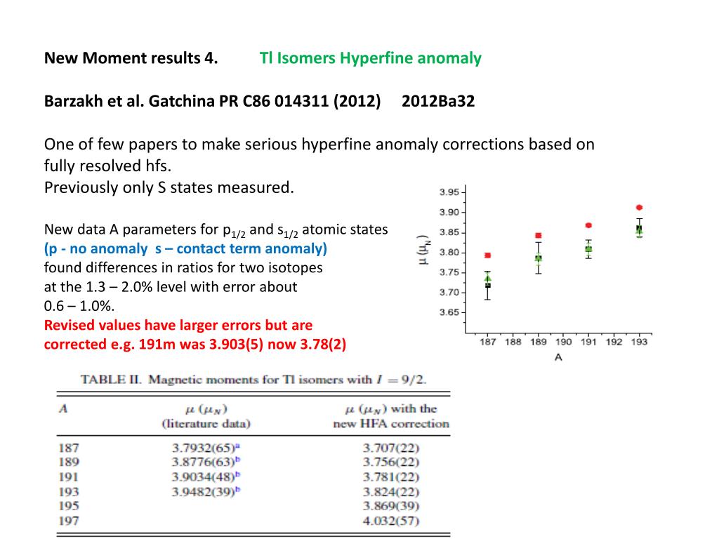 New Moment results 4. TlIsomers Hyperfine anomaly Barzakhet al. Gatchina PR C86 014311 (2012) 2012Ba32 One of few papers to make serious hyperfine anomaly corrections based on fully resolved hfs. Previously only S states measured. New data A parameters for p1/2 and s1/2 atomic states (p - no anomaly s – contact term anomaly) found differences in ratios for two isotopes at the 1.3 – 2.0% level with error about 0.6 – 1.0%. Revised values have larger errors but are corrected e.g. 191m was 3.903(5) now 3.78(2)