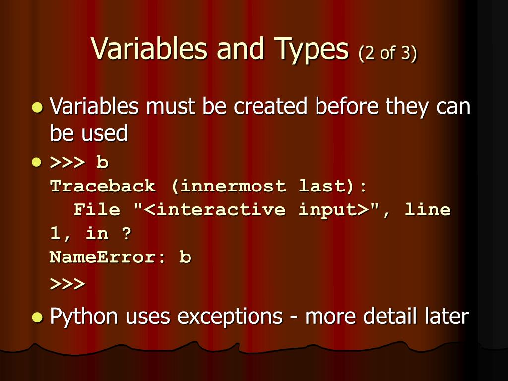 Variables and Types (2 of 3) • Variables must be created before they can be used • >>> bTraceback (innermost last): File "<interactive input>", line 1, in ?NameError: b>>> • Python uses exceptions - more detail later