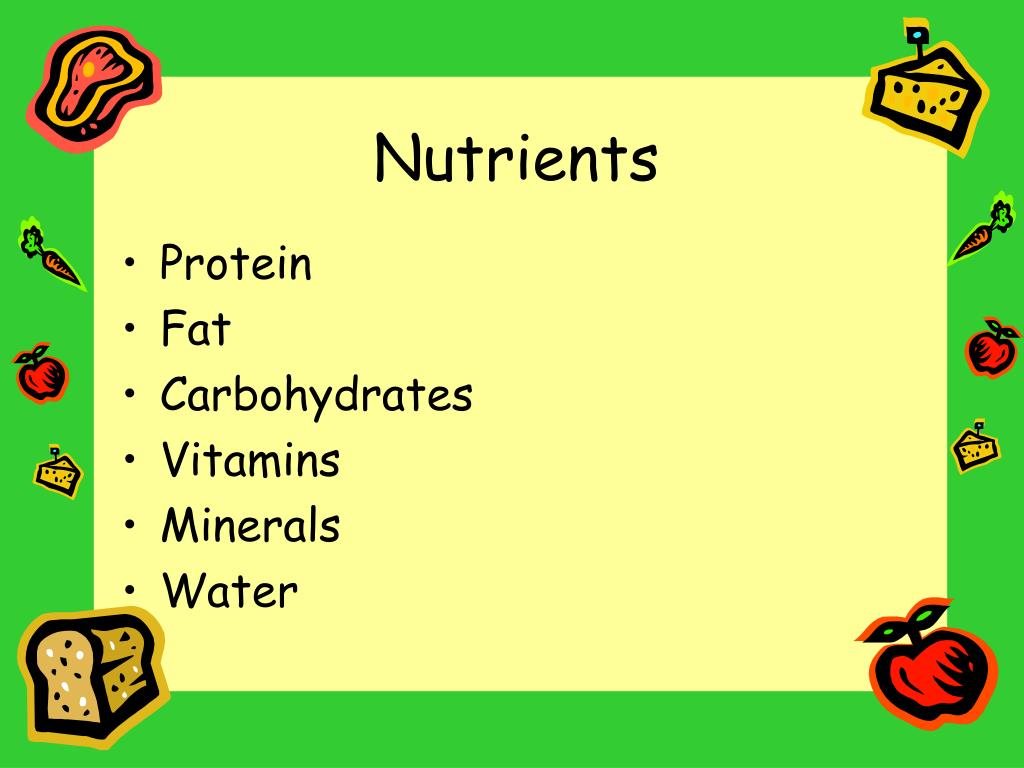 Nutrients • Protein • Fat • Carbohydrates • Vitamins • Minerals • Water