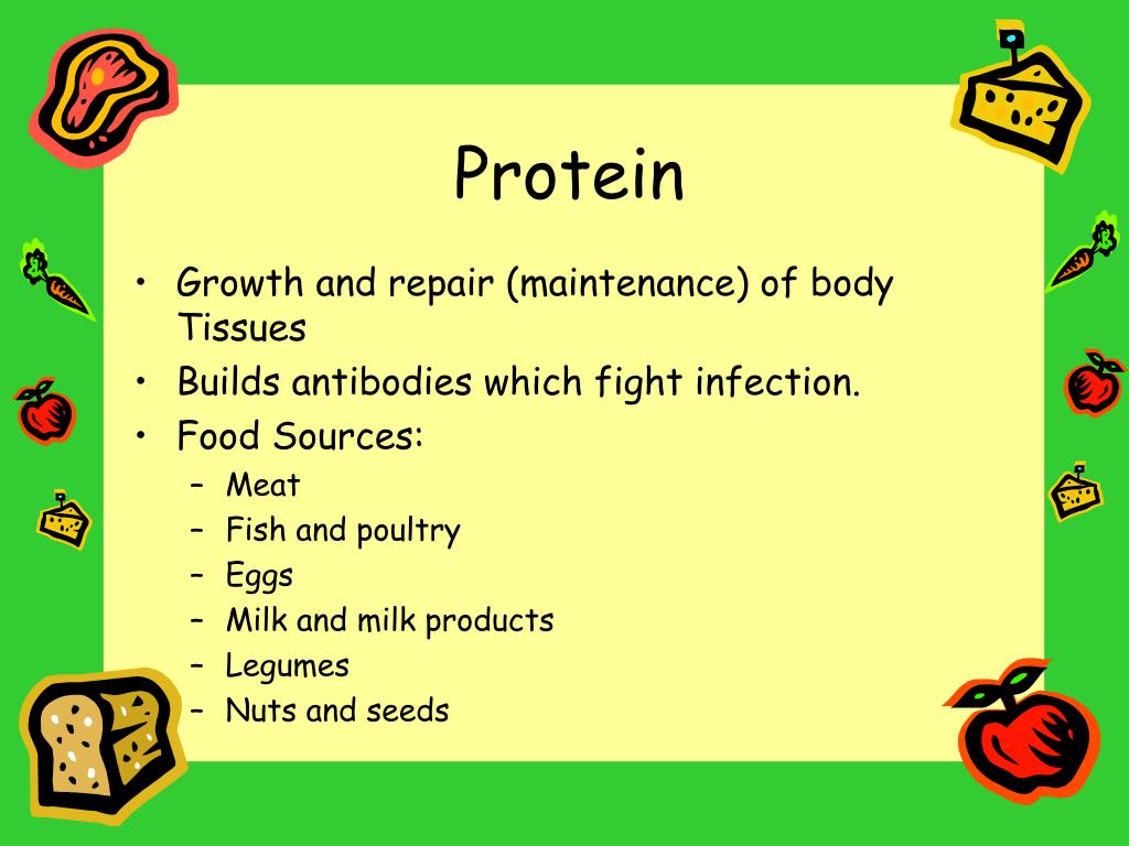 Nutrition . Nutrients and Canada’s Food Guide to Healthy Eating. Nutrients. Protein Fat Carbohydrates Vitamins Minerals Water. Protein. Growth and repair (maintenance) of body Tissues Builds antibodies which fight infection. Food Sources: Meat Fish and poultry Eggs