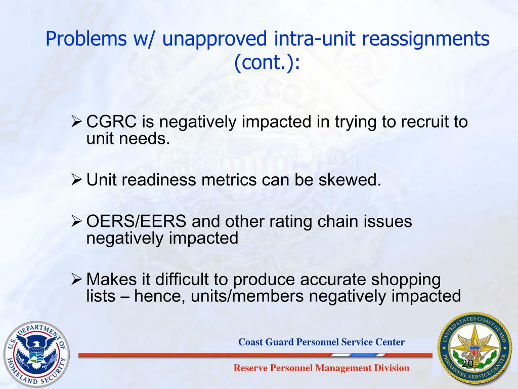Problems w/ unapproved intra-unit reassignments(cont.): • CGRC is negatively impacted in trying to recruit to unit needs. • Unit readiness metrics can be skewed. • OERS/EERS and other rating chain issues negatively impacted • Makes it difficult to produce accurate shopping lists – hence, units/members negatively impacted