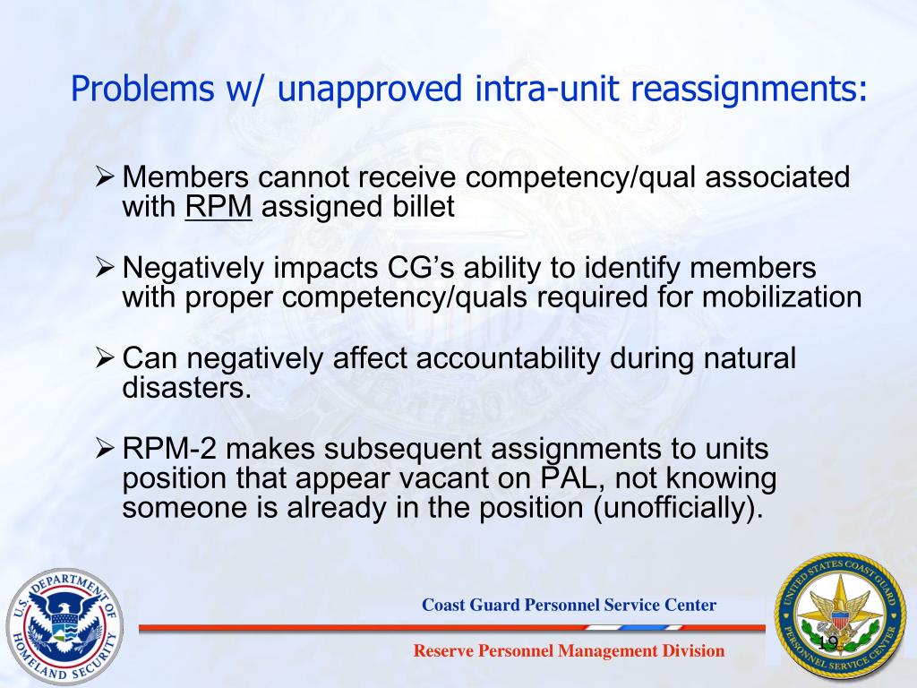 Problems w/ unapproved intra-unit reassignments: • Members cannot receive competency/qual associated with RPM assigned billet • Negatively impacts CG’s ability to identify members with proper competency/quals required for mobilization • Can negatively affect accountability during natural disasters. • RPM-2 makes subsequent assignments to units position that appear vacant on PAL, not knowing someone is already in the position (unofficially).