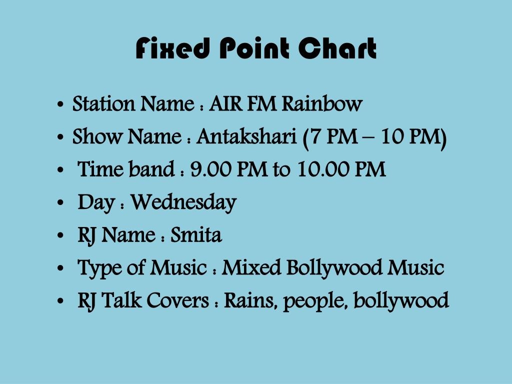 Fixed Point Chart • Station Name : AIR FM Rainbow • Show Name : Antakshari (7 PM – 10 PM) • Time band : 9.00 PM to 10.00 PM • Day : Wednesday • RJ Name : Smita • Type of Music : Mixed Bollywood Music • RJ Talk Covers : Rains, people, bollywood