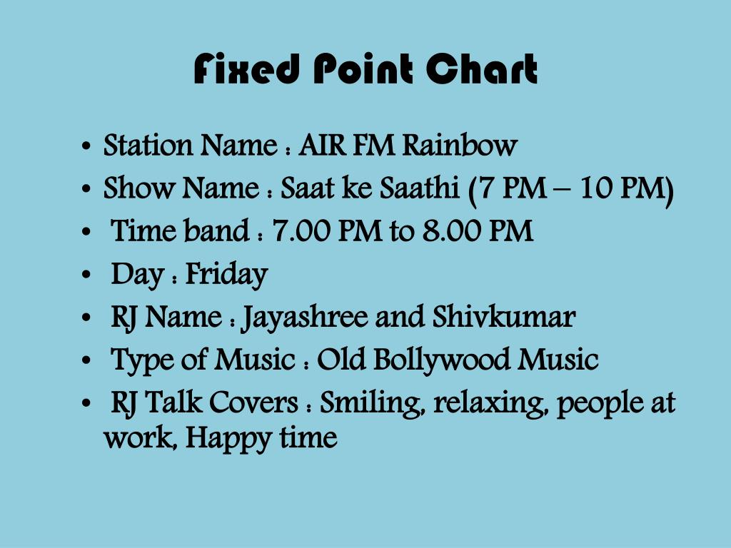 Fixed Point Chart • Station Name : AIR FM Rainbow • Show Name : SaatkeSaathi (7 PM – 10 PM) • Time band : 7.00 PM to 8.00 PM • Day : Friday • RJ Name : Jayashree and Shivkumar • Type of Music : Old Bollywood Music • RJ Talk Covers : Smiling, relaxing, people at work, Happy time