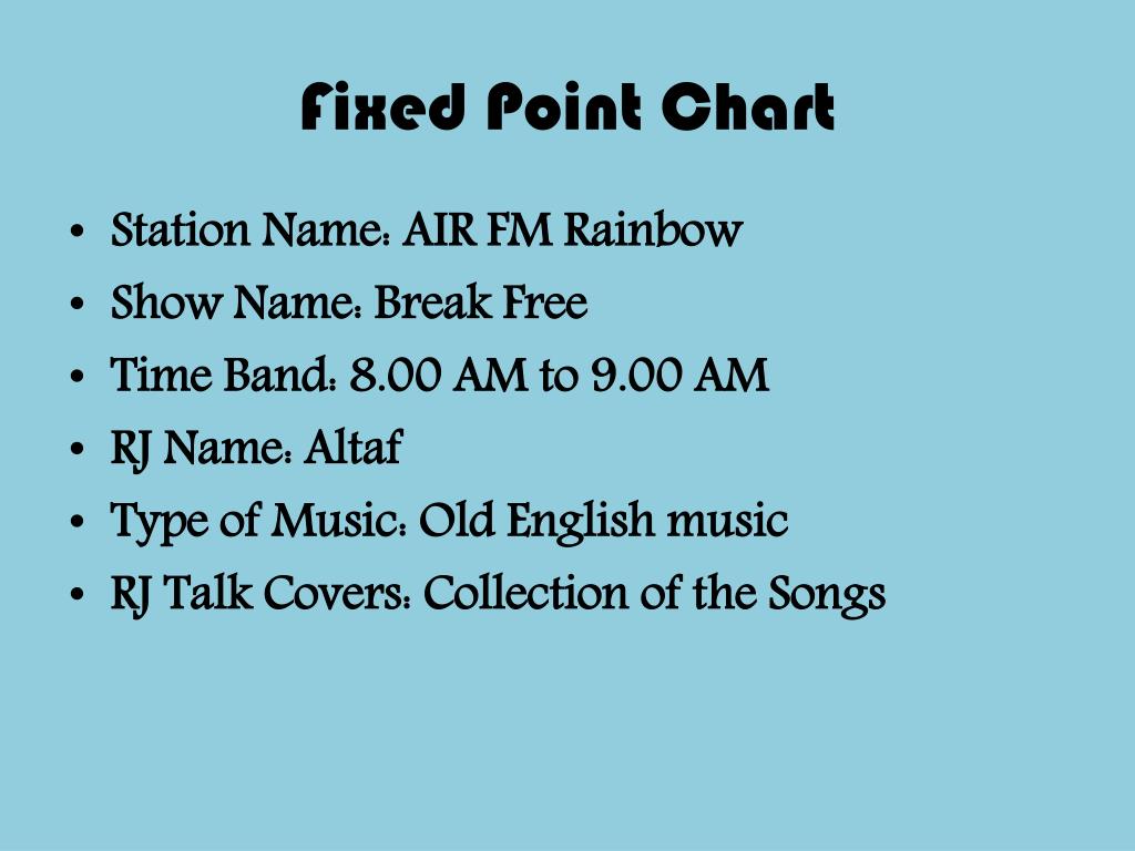 Fixed Point Chart • Station Name: AIR FM Rainbow • Show Name: Break Free • Time Band: 8.00 AM to 9.00 AM • RJ Name: Altaf • Type of Music: Old English music • RJ Talk Covers: Collection of the Songs