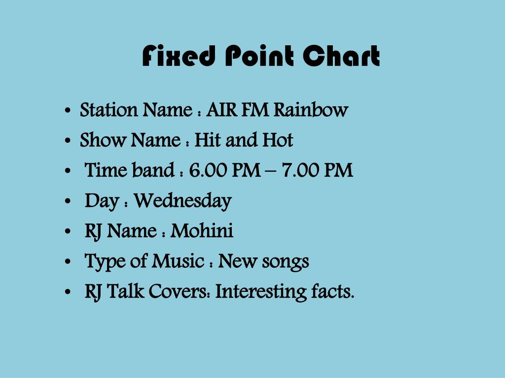 Fixed Point Chart • Station Name : AIR FM Rainbow • Show Name : Hit and Hot • Time band : 6.00 PM – 7.00 PM • Day : Wednesday • RJ Name : Mohini • Type of Music : New songs • RJ Talk Covers: Interesting facts.