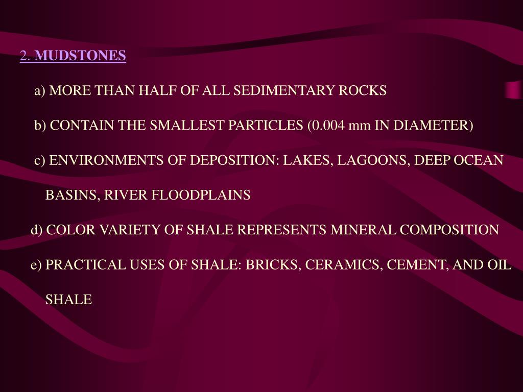 2. MUDSTONES a) MORE THAN HALF OF ALL SEDIMENTARY ROCKS b) CONTAIN THE SMALLEST PARTICLES (0.004 mm IN DIAMETER) c) ENVIRONMENTS OF DEPOSITION: LAKES, LAGOONS, DEEP OCEAN BASINS, RIVER FLOODPLAINS d) COLOR VARIETY OF SHALE REPRESENTS MINERAL COMPOSITION e) PRACTICAL USES OF SHALE: BRICKS, CERAMICS, CEMENT, AND OIL SHALE