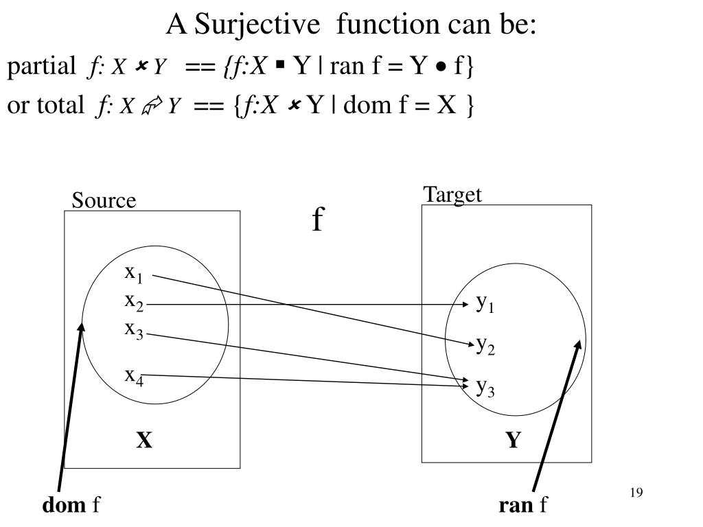 A Surjective function can be: partial f: X Y == {f:X Y | ran f = Y f} or total f: X Y == {f:X Y | dom f = X } Target Source f x1 x2 x3 x4 y1 y2 y3 X Y dom f ran f