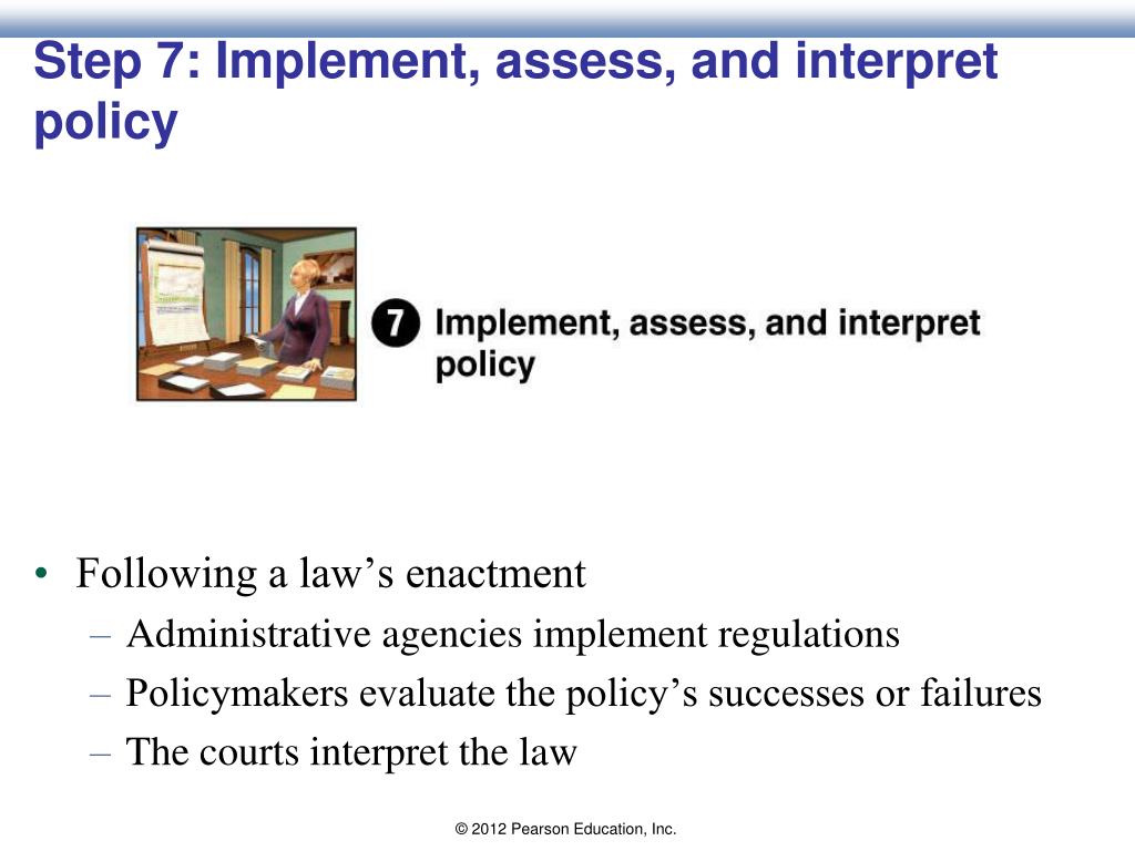 Step 7: Implement, assess, and interpret policy • Following a law’s enactment • Administrative agencies implement regulations • Policymakers evaluate the policy’s successes or failures • The courts interpret the law