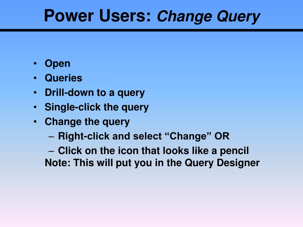 Power Users: Change Query • Open • Queries • Drill-down to a query • Single-click the query • Change the query • Right-click and select “Change” OR • Click on the icon that looks like a pencil Note: This will put you in the Query Designer