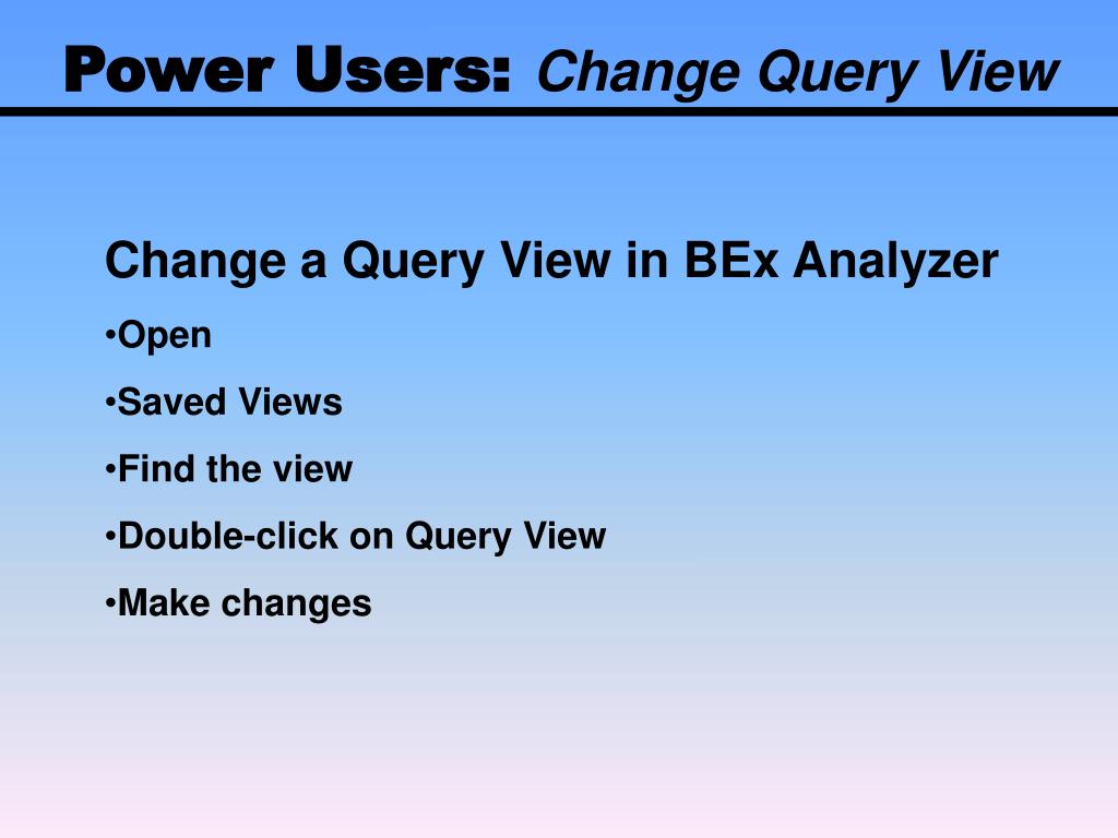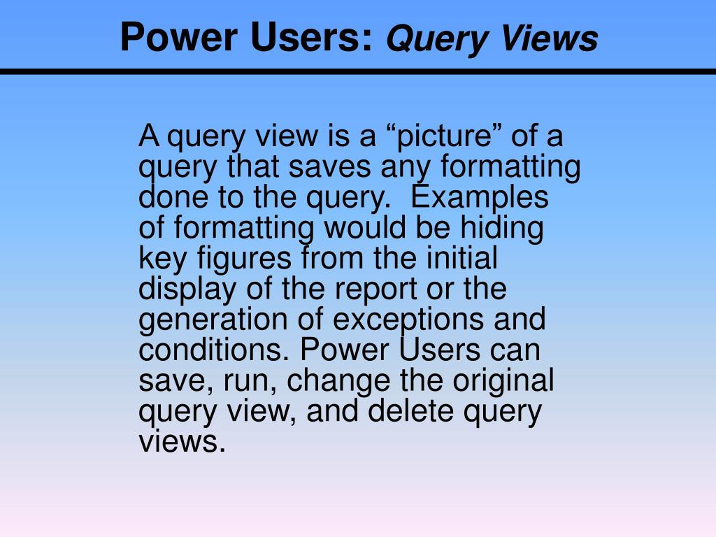 Power Users: Query Views A query view is a “picture” of a query that saves any formatting done to the query. Examples of formatting would be hiding key figures from the initial display of the report or the generation of exceptions and conditions. Power Users can save, run, change the original query view, and delete query views.