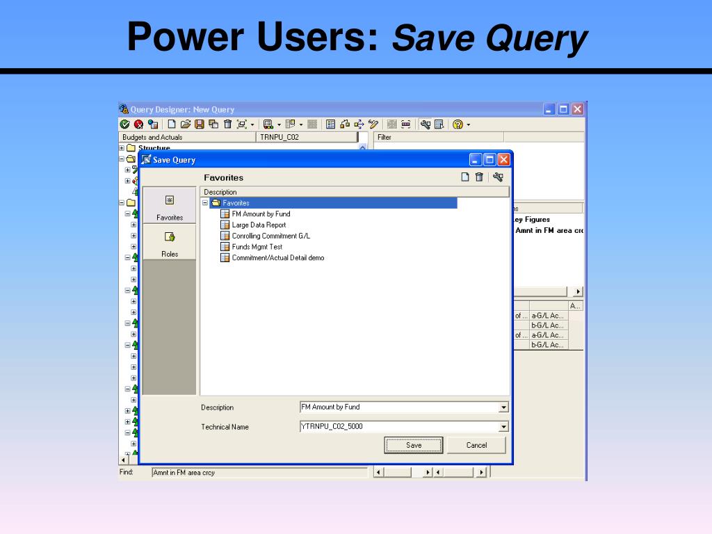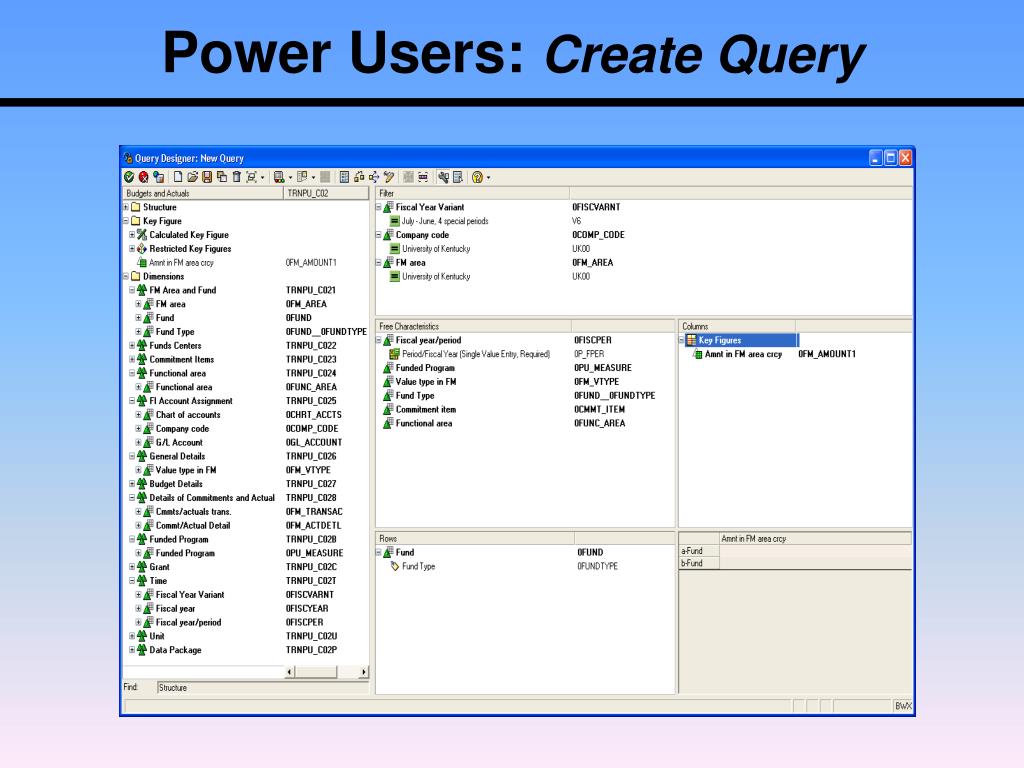 Power Users: Run Query • There are two ways to display the output of a query, • in Excel or on the web. • Display Report in Excel • If in the Query Designer • Click on the first icon (green ball with a check mark in it) • If not in Query Designer • Open • Queries • Drill-down to a query • Double-click the query and it will run in Excel.