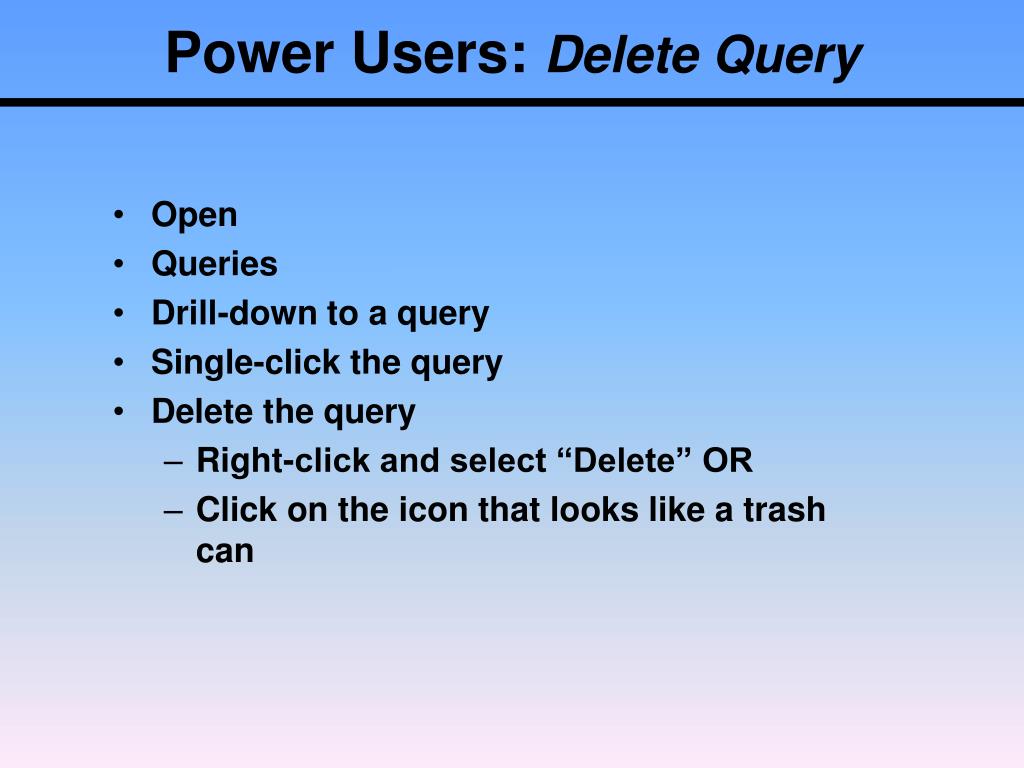 Power Users: Delete Query • Open • Queries • Drill-down to a query • Single-click the query • Delete the query • Right-click and select “Delete” OR • Click on the icon that looks like a trash can